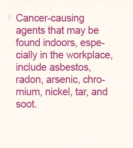 - Cancer-causing agents that may be found indoors, especially in the workplace, include asbestos, radon, arsenic, chromium, nickel, tar, and soot. These substances can cause lung cancer in people who have never smoked.